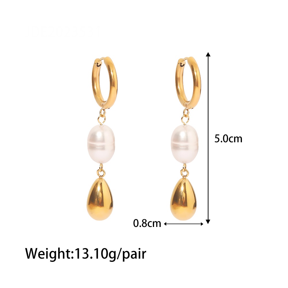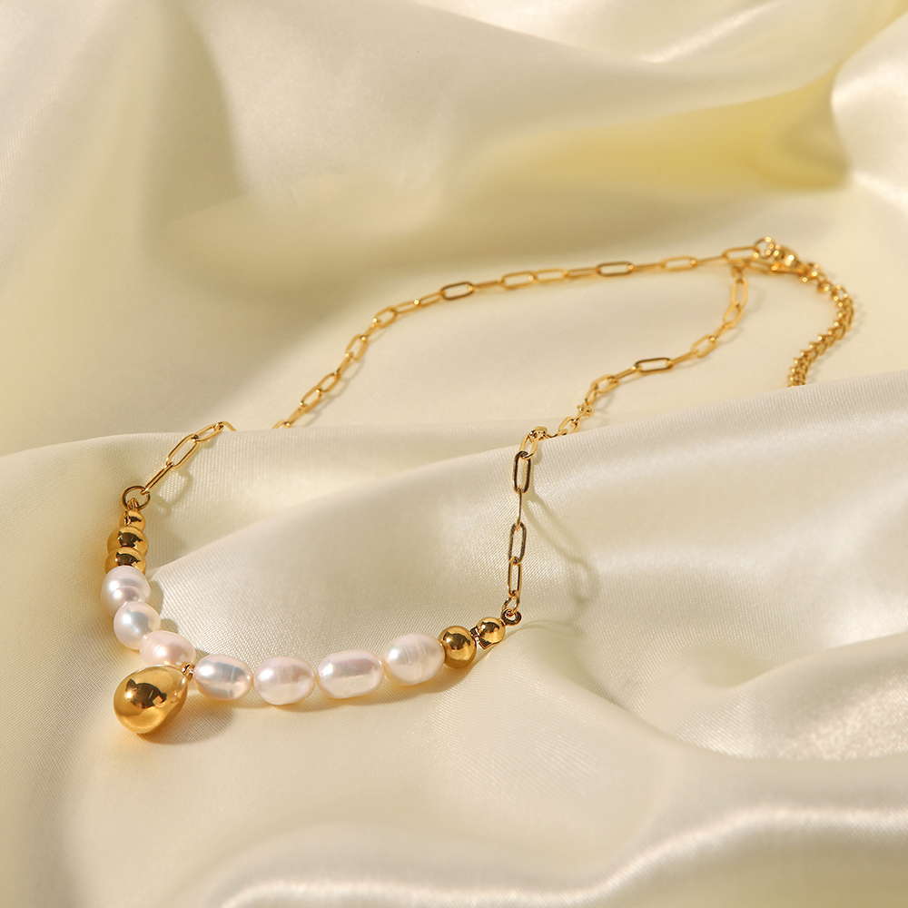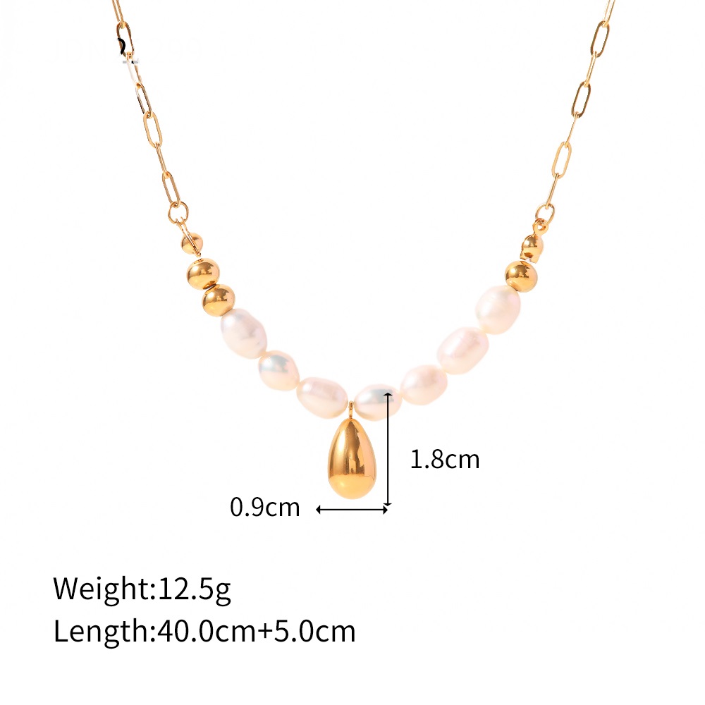 Le collier se distingue par une harmonie de perles d’eau douce naturelles, de perles dorées, et d’un pendentif goutte brillant. Les boucles d’oreilles, assorties au collier, présentent une créole en or 18K, ornée d’une perle et d’un pendentif doré pour un style chic et féminin.